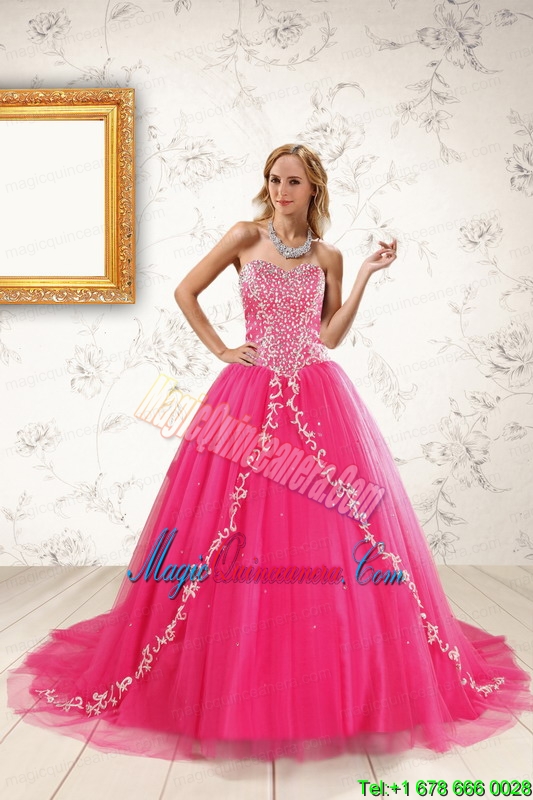 , 2015 Beautiful Hot Pink Quinceanera Dresses with Beading and Appliques
