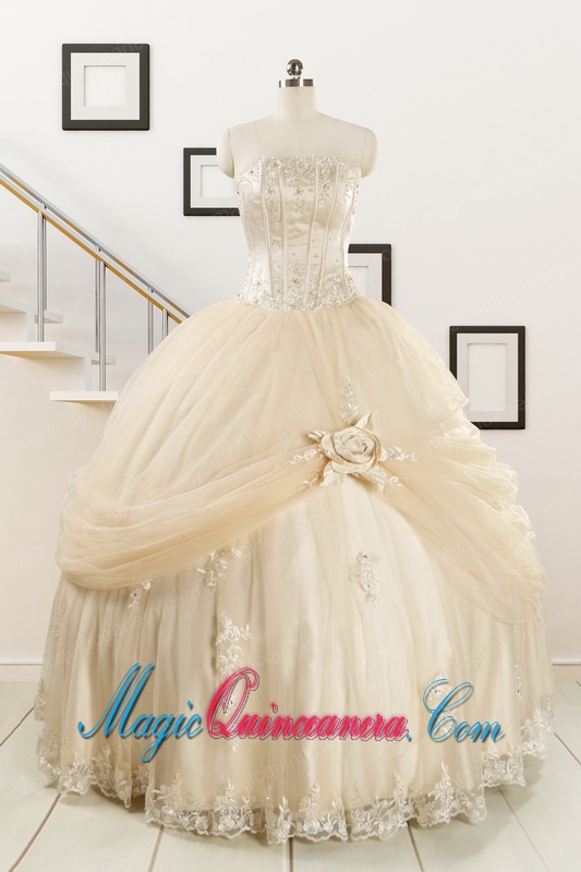 2015 Classical Appliques and Hand Made Flower Quinceanera Dresses in Champagne