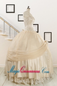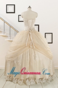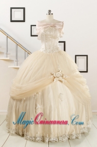 , 2015 Classical Appliques and Hand Made Flower Quinceanera Dresses in Champagne