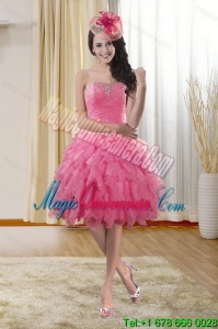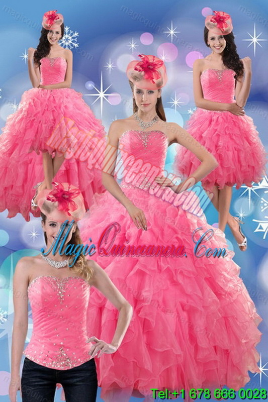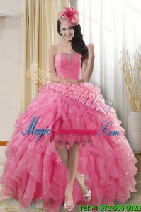 , 2015 Detachable Rose Pink Strapless Dresses for Quince with Ruffles and Beading
