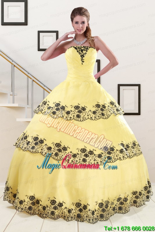 2015 Light Yellow Quinceanera Dress with Appliques and Ruffled Layers