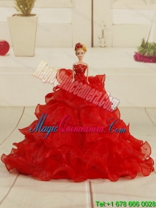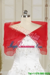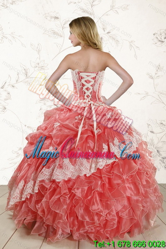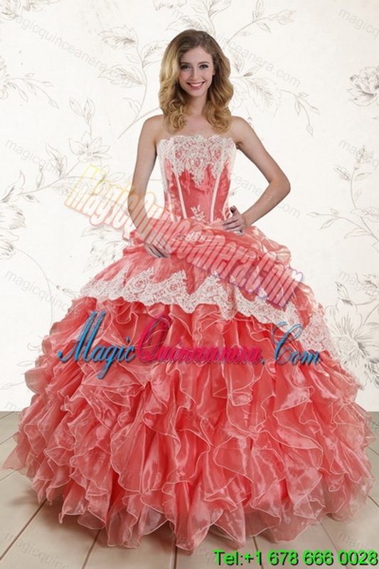 , 2015 Luxury Watermelon Strapless Quince Dresses with Appliques and Ruffles