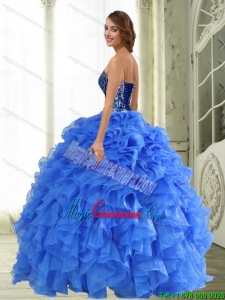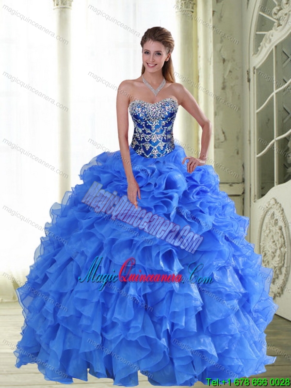 , 2015 New Style Beading and Ruffles Strapless Sweet 15 Dresses in Blue