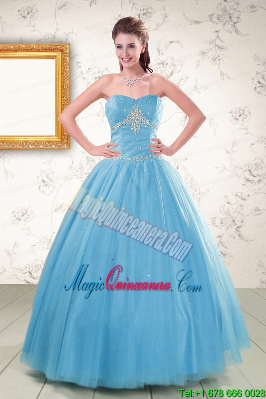 2015 New Style Strapless Beading Quinceanera Dresses in Aqua Blue
