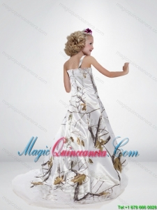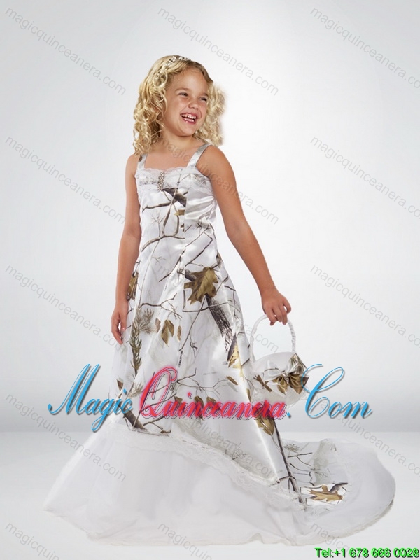 2015 Popular A Line Straps Camo Little Girl Pageant Dress with Brush Train Beading