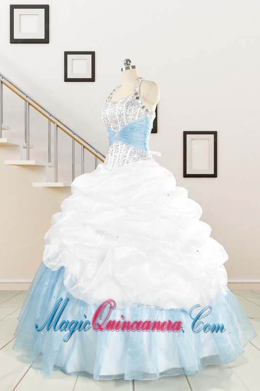 2015 Pretty Halter White and Blue Quinceanera Dress with Beading