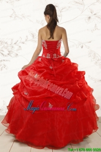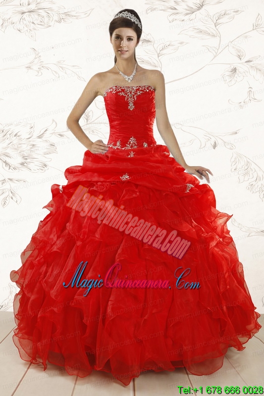 , 2015 Red Ball Gown Strapless Sweet 15 Dresses with Beading and Ruffles