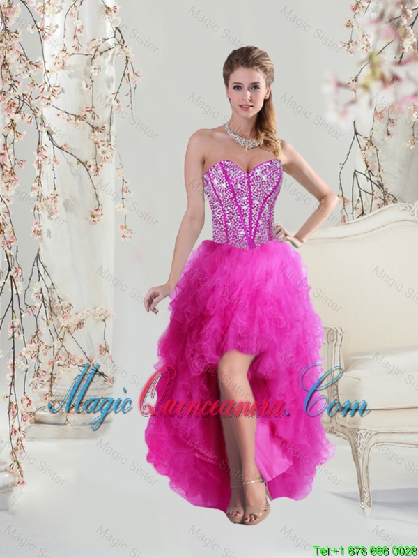 2016 Afforable High Low Sweetheart Fuchsia Dama Dresses with Beading and Ruffles