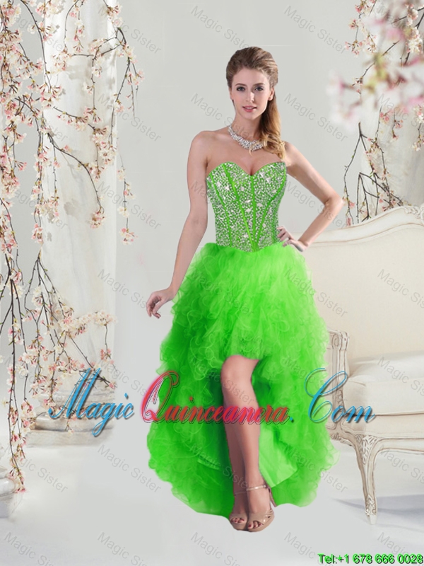 2016 Inexpensive High Low Sweetheart Spring Green Discount Dama Dresses with Beading