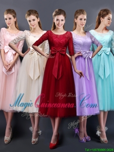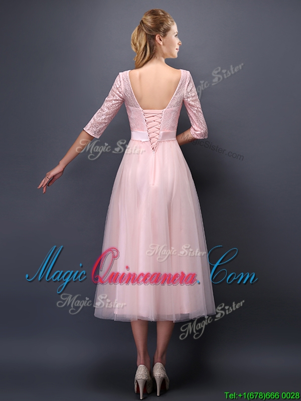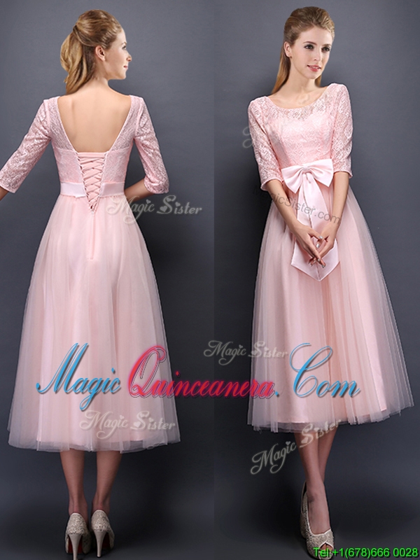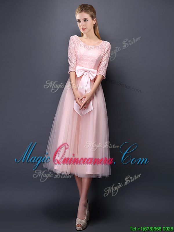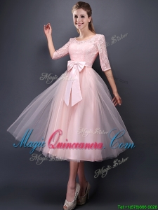 2016 Most Popular Scoop Half Sleeves Baby Pink Dama Dress with Bowknot