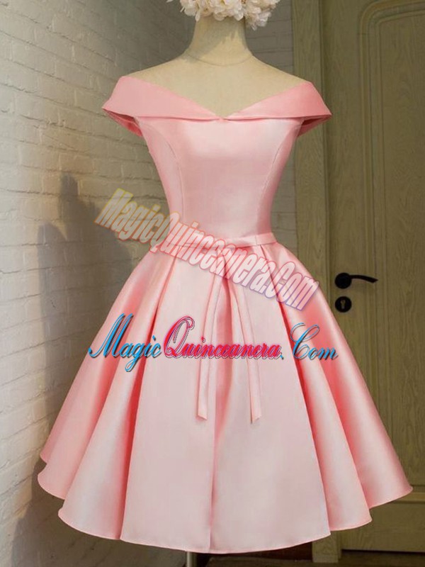 A-line Court Dresses for Sweet 16 Baby Pink Off The Shoulder Taffeta 3 4 Length Sleeve Knee Length Lace Up