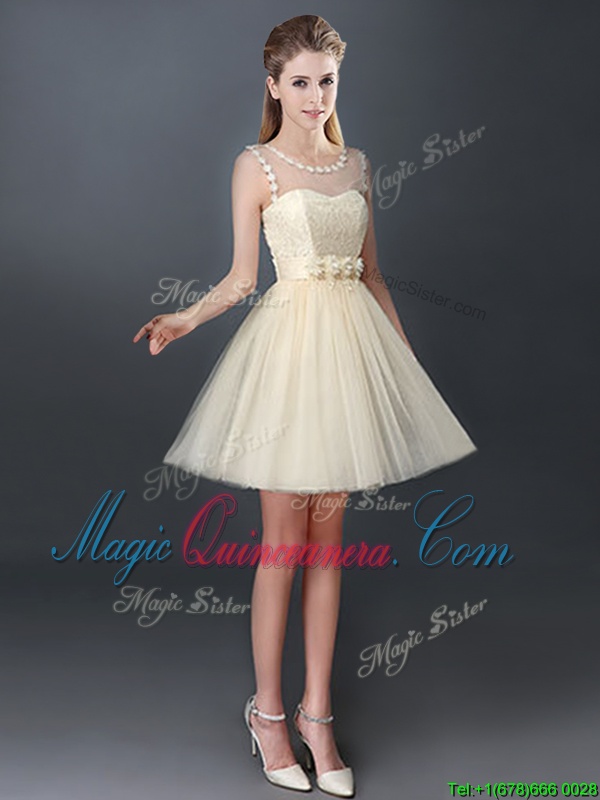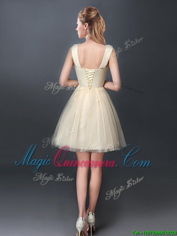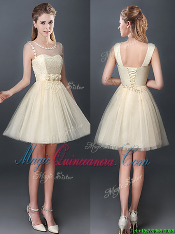 A-line Damas Dress Champagne Scoop Tulle Sleeveless Mini Length Lace Up