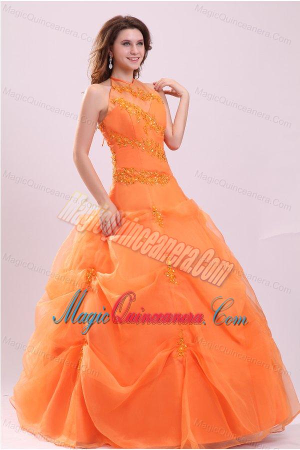 awesome organza quinceanera dress, A-line Orange Halter Top Neck Appliques with Beading Quinceanera Dress
