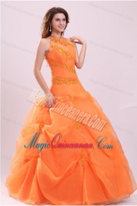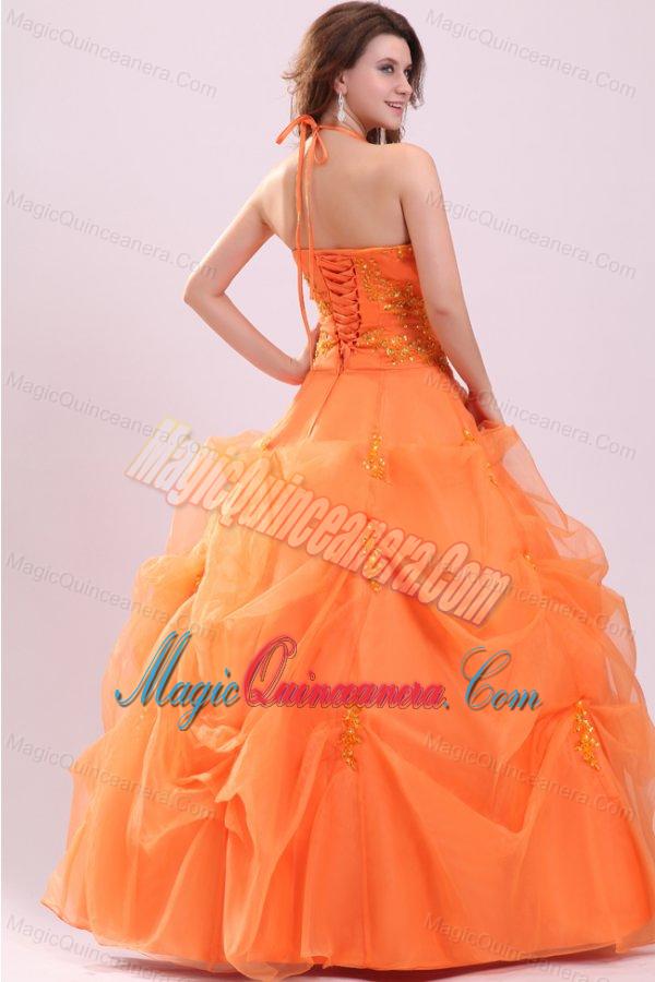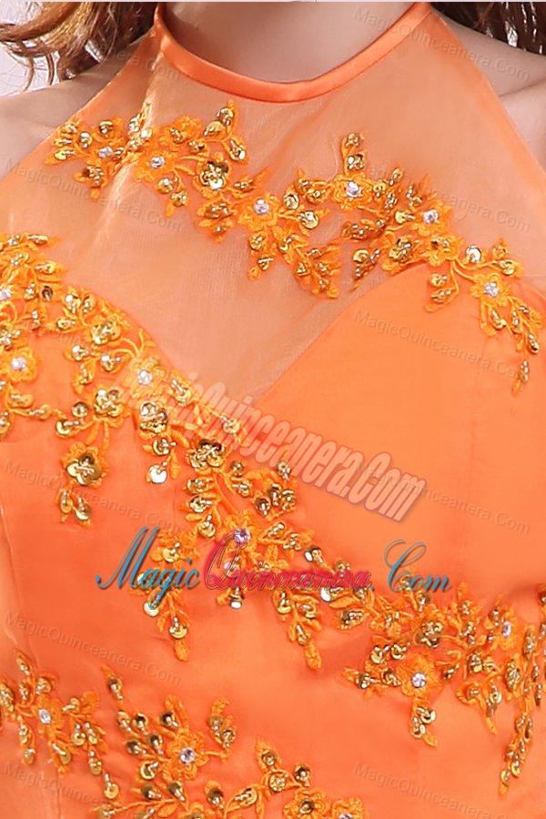 A-line Orange Halter Top Neck Appliques with Beading Quinceanera Dress