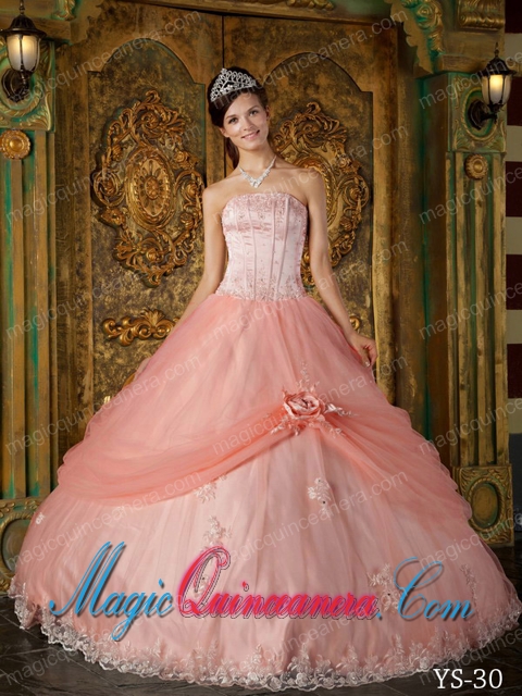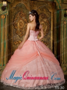 A Watermelon Ball Gown Strapless With Appliques Tulle Classic Quinceanera Gowns