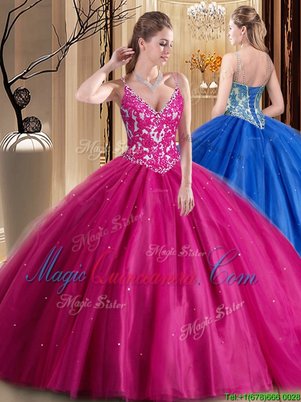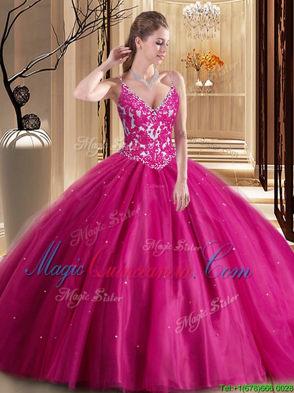 Admirable Floor Length Lace Up Quinceanera Gowns Hot Pink and In for Military Ball and Sweet 16 and Quinceanera with Beading and Appliques
