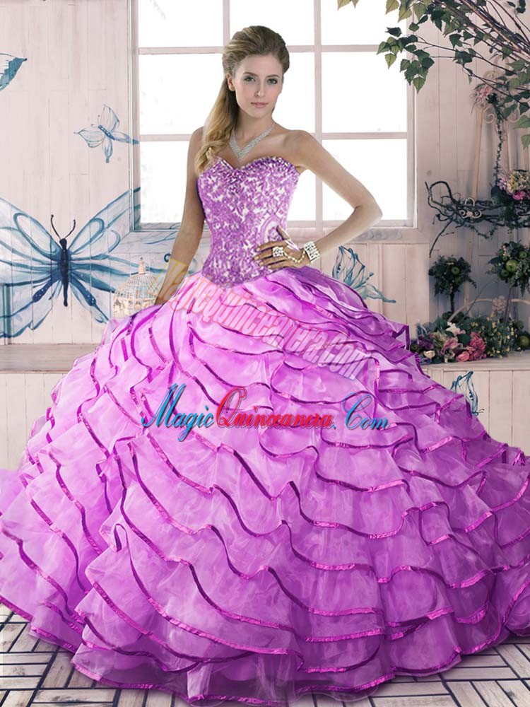 Admirable Lilac Ball Gowns Beading and Ruffles 15 Quinceanera Dress Lace Up Organza Sleeveless