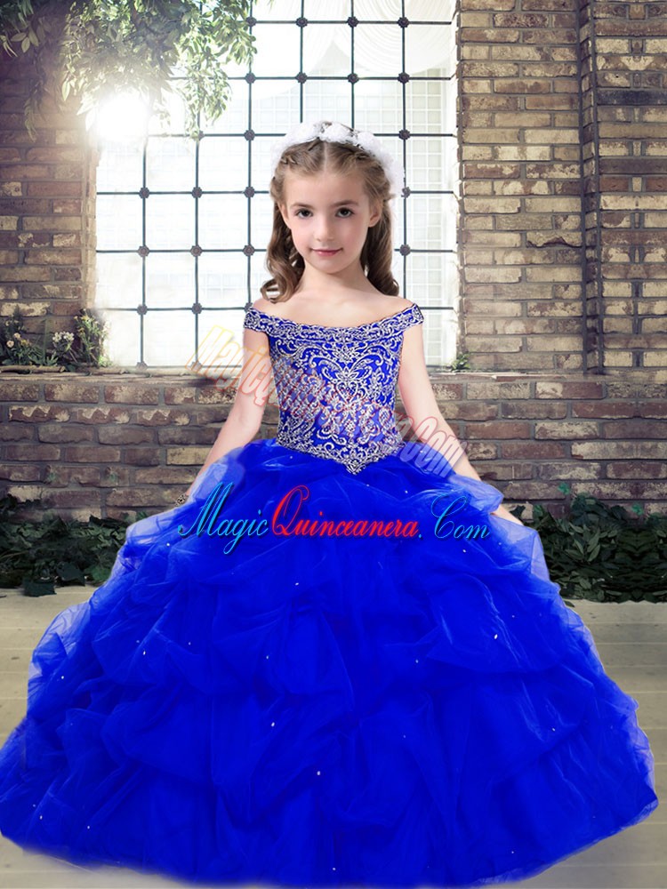 , Admirable Scoop Sleeveless Lace Up Kids Formal Wear Royal Blue Organza