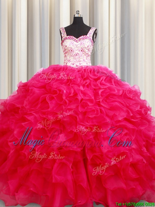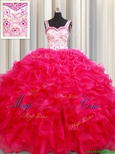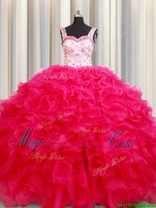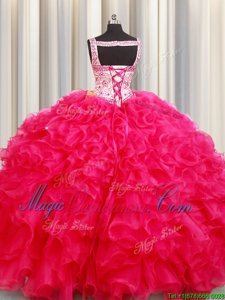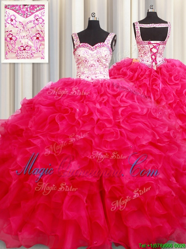 Adorable Hot Pink Ball Gowns Straps Sleeveless Organza Floor Length Lace Up Embroidery and Ruffles 15 Quinceanera Dress