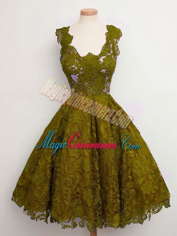 Adorable Knee Length Lace Up Quinceanera Court Dresses Olive Green for Prom and Party and Wedding Party with Lace