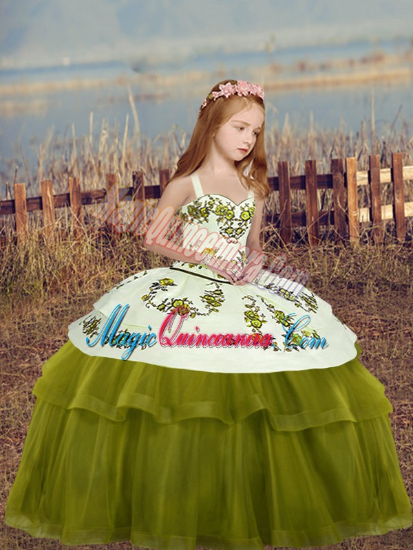 Adorable Olive Green Straps Lace Up Embroidery Kids Formal Wear Sleeveless