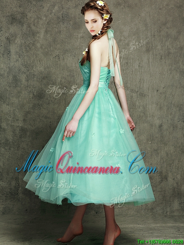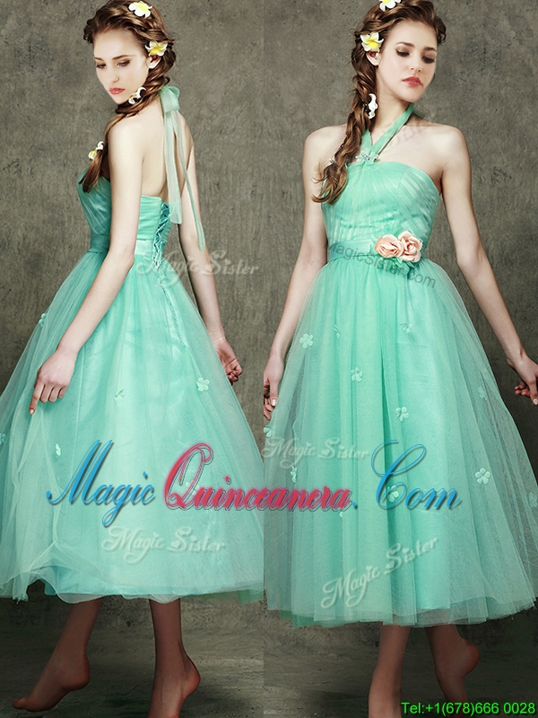 , Afforable Halter Top Dama Dress with Appliques and Hand Made Flowers