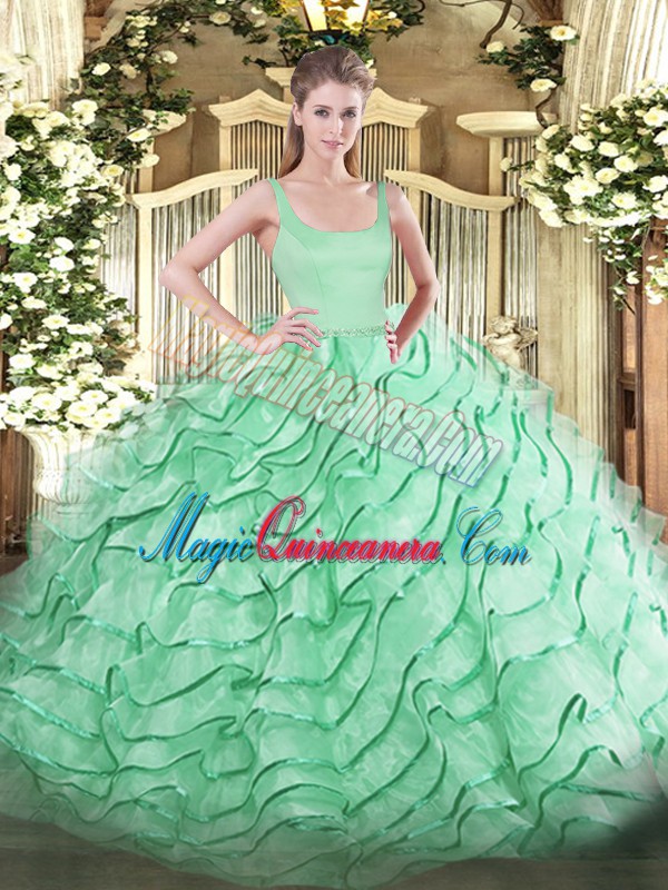 Affordable Apple Green Organza Zipper Sweet 16 Quinceanera Dress Sleeveless Brush Train Ruffled Layers