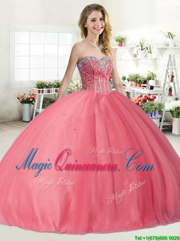 Affordable Beaded Big Puffy Quinceanera Dress in Coral Red