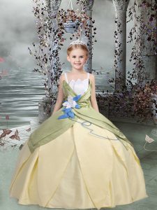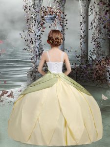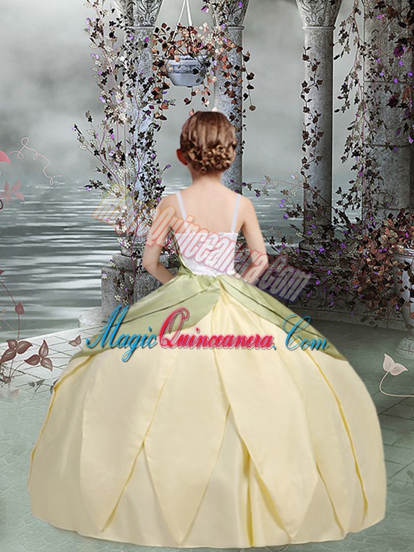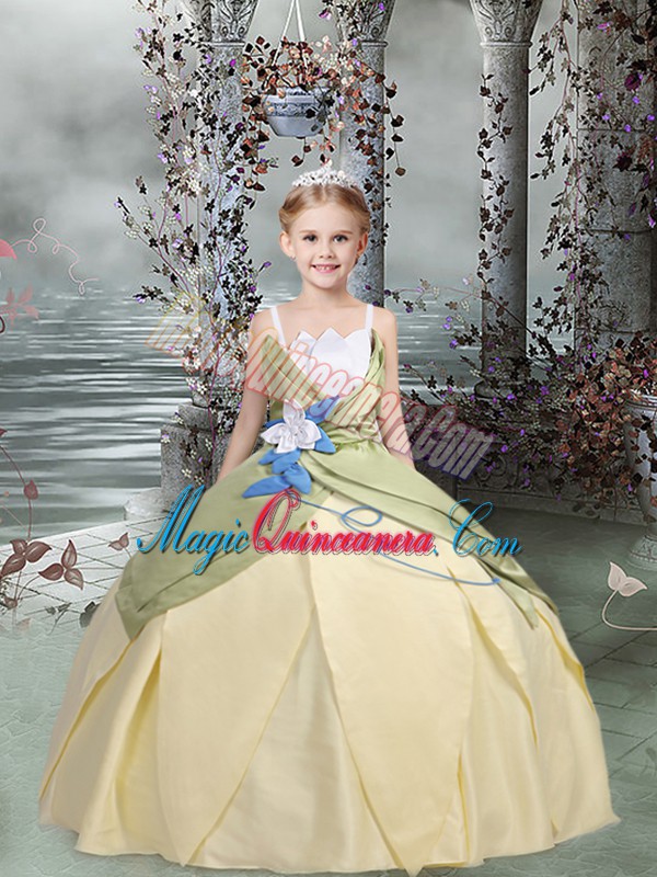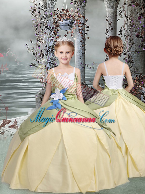 Affordable Champagne Ball Gowns Spaghetti Straps Sleeveless Taffeta Floor Length Lace Up Ruching and Hand Made Flower Glitz Pageant Dress