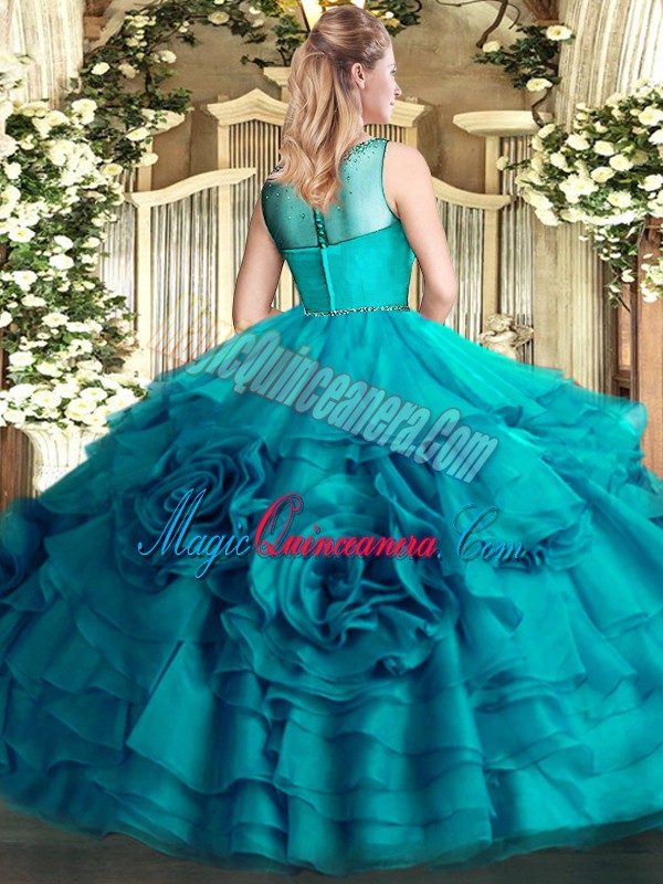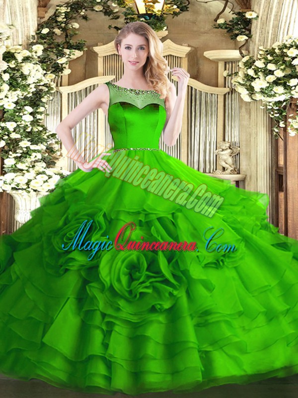 Affordable Organza Zipper Scoop Sleeveless Floor Length Quinceanera Gowns Beading and Ruffled Layers