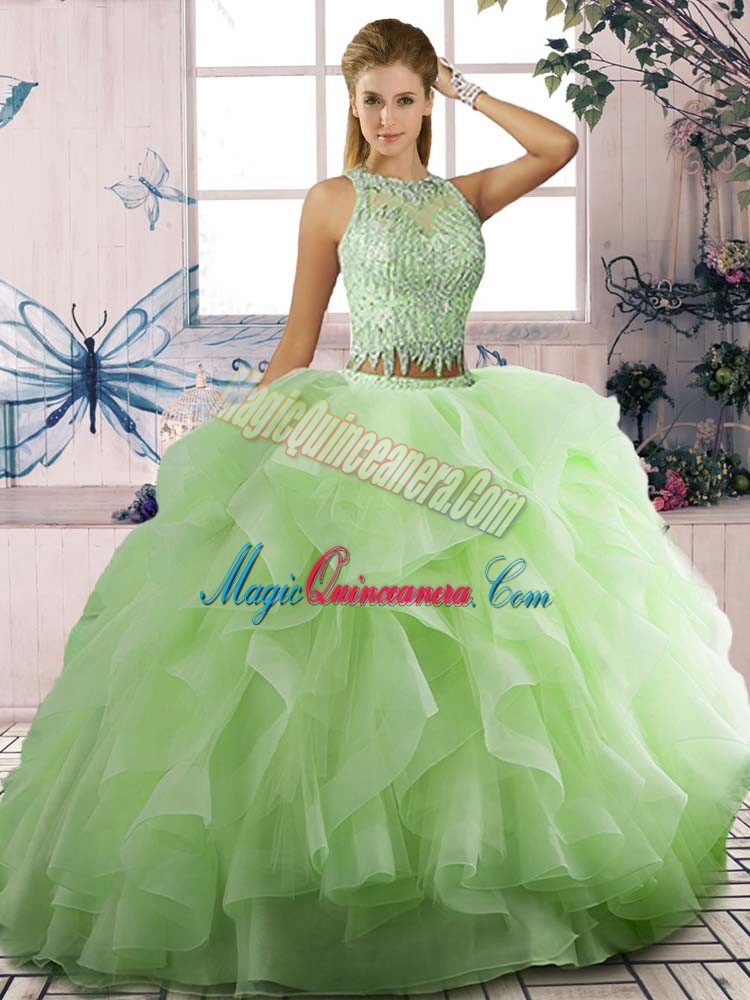 Affordable Sleeveless Floor Length Beading and Ruffles Lace Up Quinceanera Gowns with Yellow Green