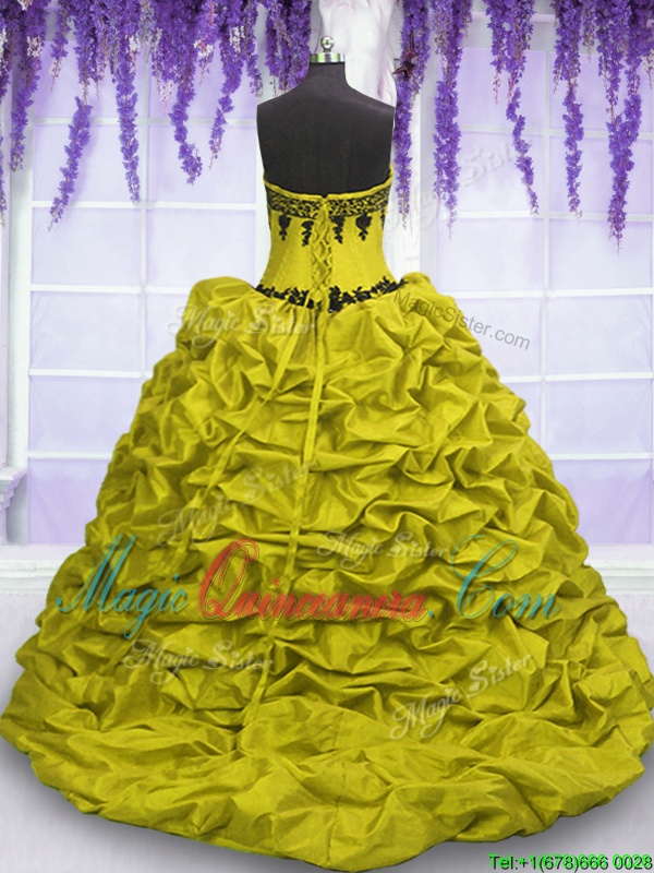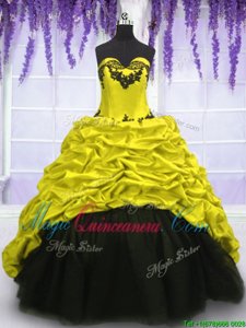 Affordable Taffeta Sweetheart Sleeveless Sweep Train Lace Up Appliques and Pick Ups Sweet 16 Quinceanera Dress in Black and Yellow Green