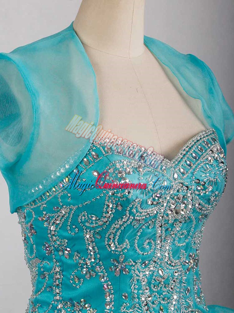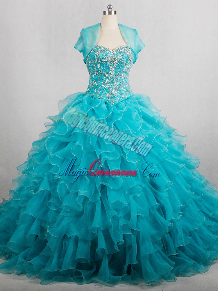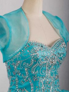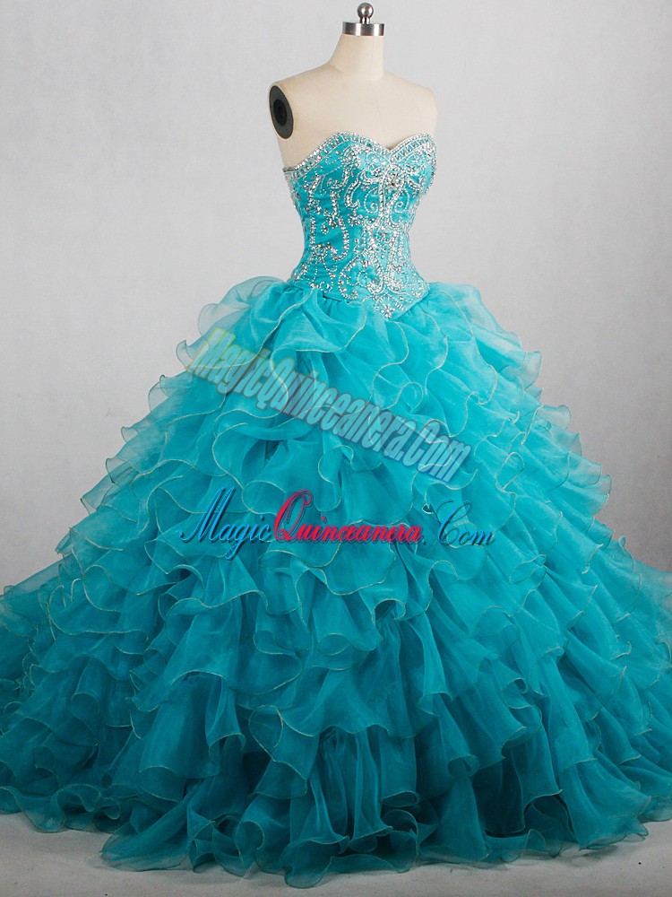 , Amazing Aqua Blue Sleeveless Brush Train Beading and Ruffles 15 Quinceanera Dress
