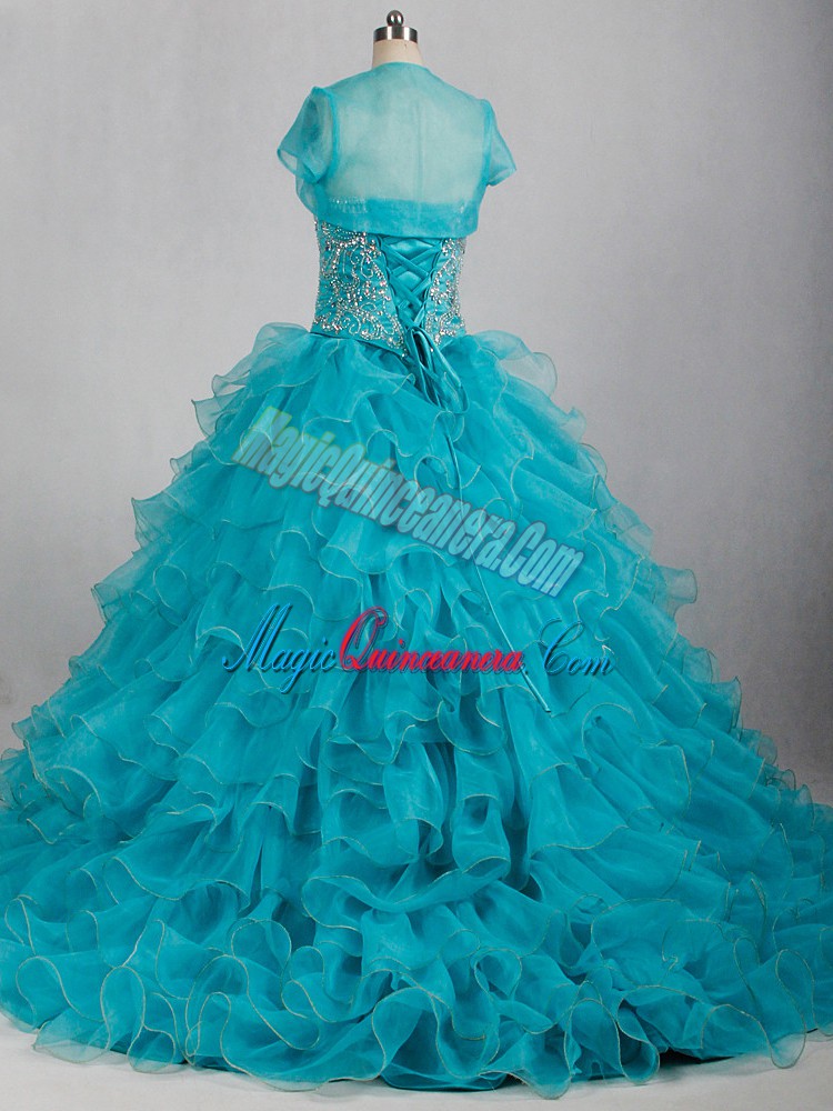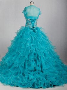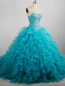 Amazing Aqua Blue Sleeveless Brush Train Beading and Ruffles 15 Quinceanera Dress