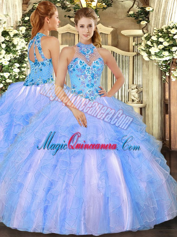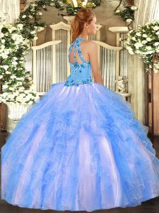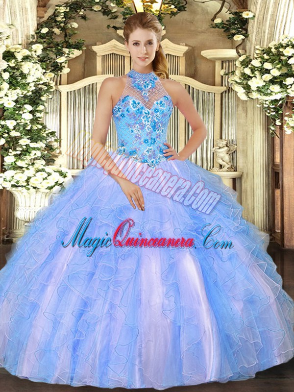 Amazing Baby Blue Organza Lace Up Halter Top Sleeveless Floor Length 15th Birthday Dress Embroidery and Ruffles