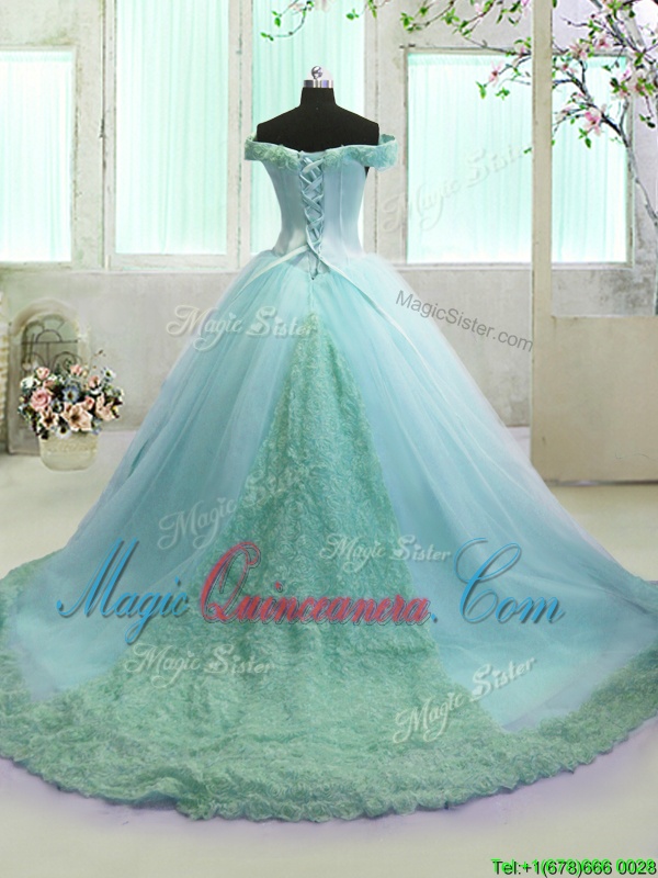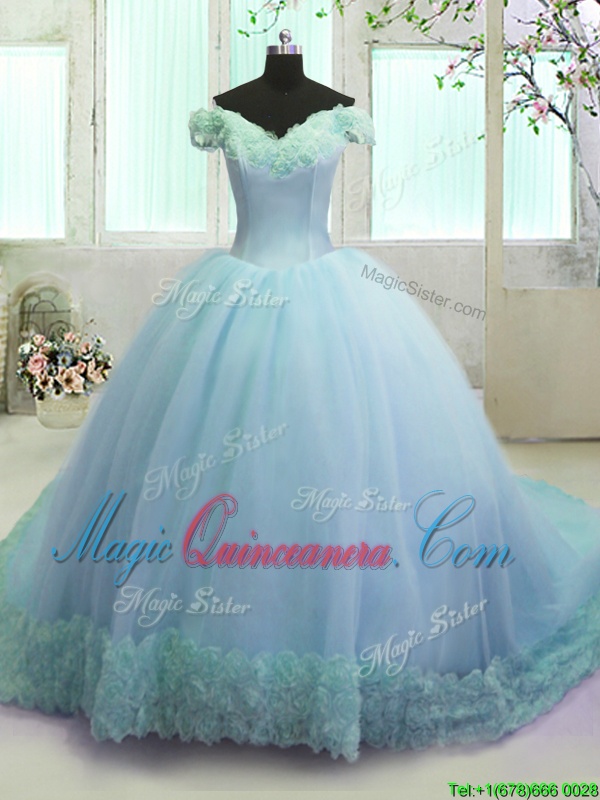 Amazing Light Blue 15 Quinceanera Dress Military Ball and Sweet 16 and Quinceanera and For with Hand Made Flower Off The Shoulder Sleeveless Court Train Lace Up