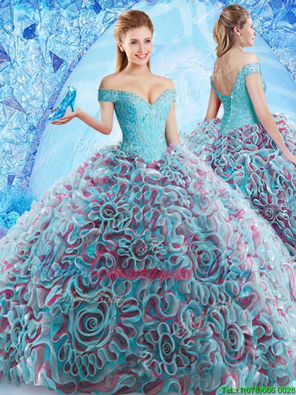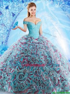 Amazing Off the Shoulder Multi-color Sleeveless Fabric With Rolling Flowers Court Train Backless 15 Quinceanera Dress for Military Ball and Sweet 16 and Quinceanera