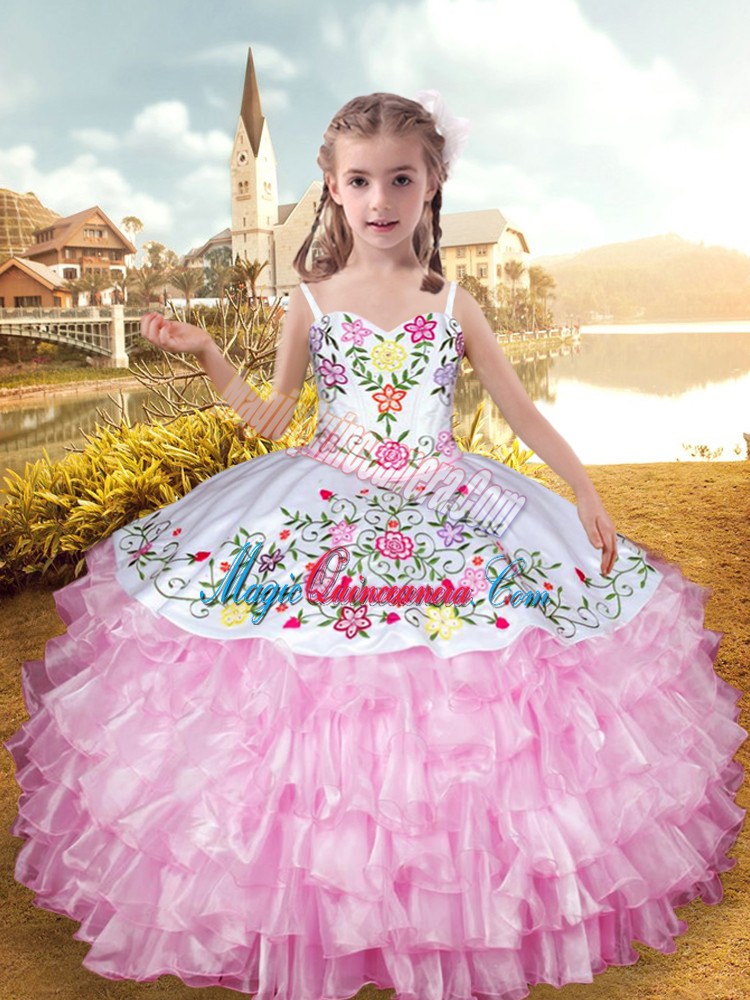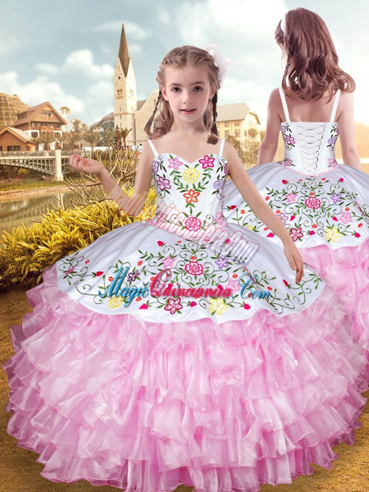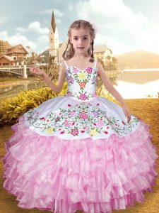 Amazing Rose Pink Organza and Taffeta Lace Up Pageant Gowns For Girls Sleeveless Floor Length Embroidery and Ruffled Layers
