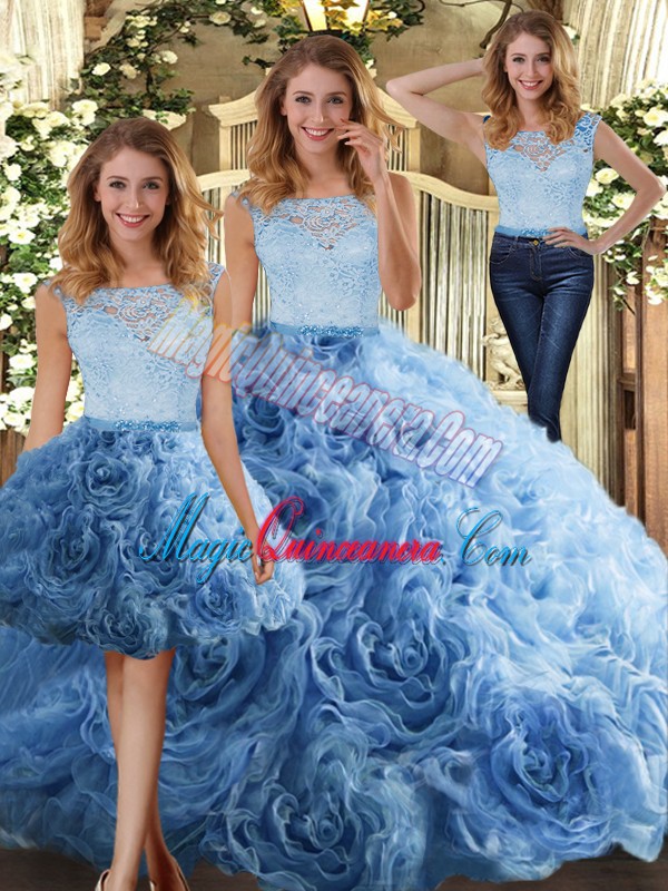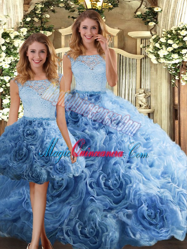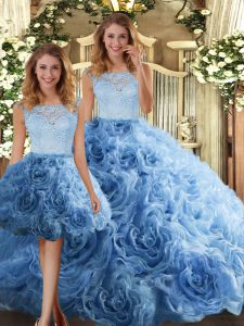 Amazing Sleeveless Fabric With Rolling Flowers Floor Length Zipper Quince Ball Gowns in Baby Blue with Lace