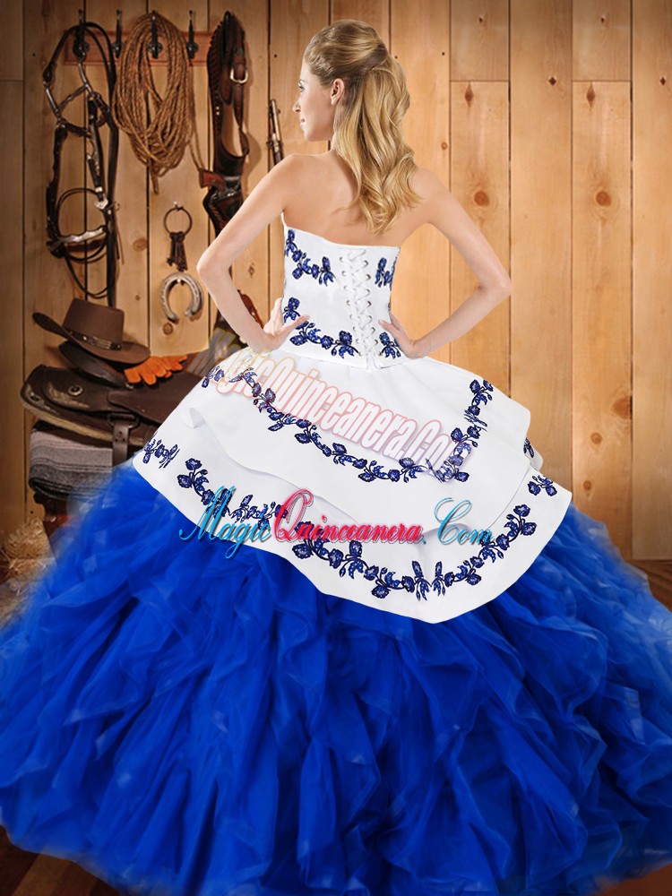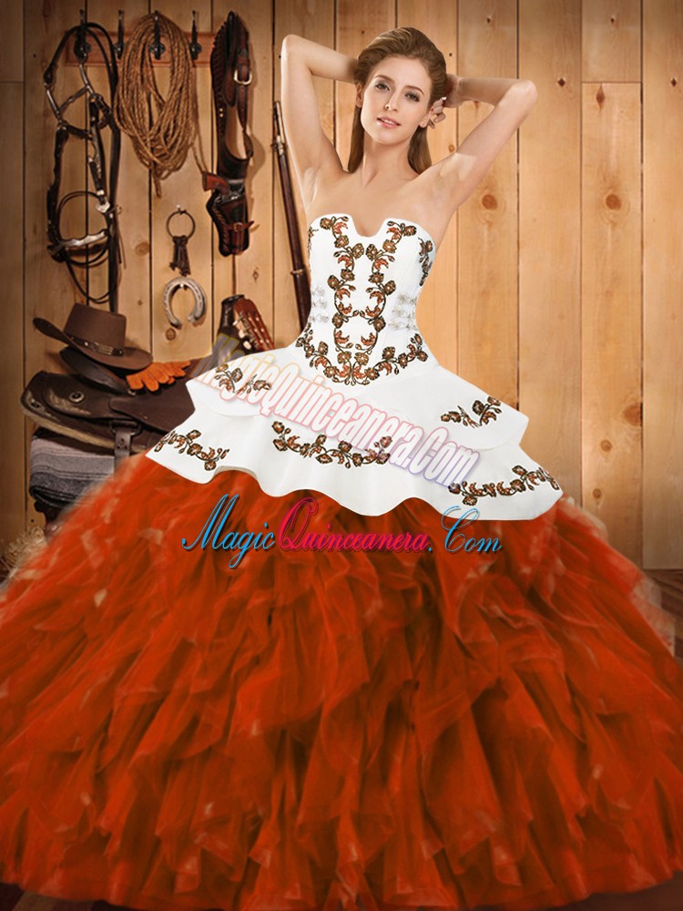Amazing Strapless Sleeveless Quince Ball Gowns Floor Length Embroidery and Ruffles Rust Red Satin and Organza