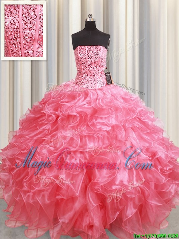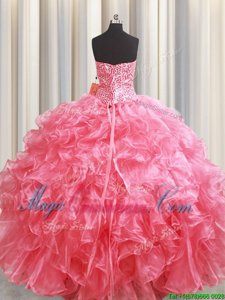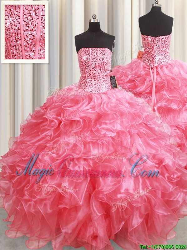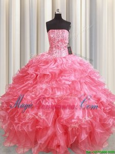Amazing Strapless Sleeveless Vestidos de Quinceanera Floor Length Beading and Ruffles Pink Organza