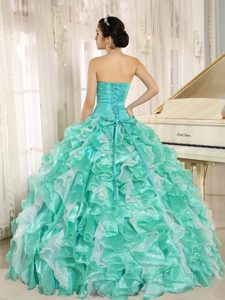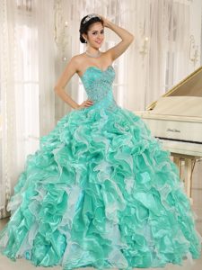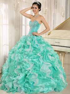 Apple Green and White Quinceanera Dress with Beaded Bodice and Ruffles