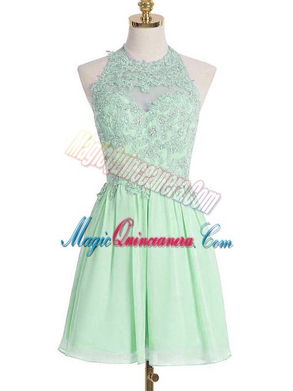 Apple Green Quinceanera Court Dresses Prom and Party and Wedding Party with Appliques Halter Top Sleeveless Lace Up