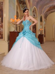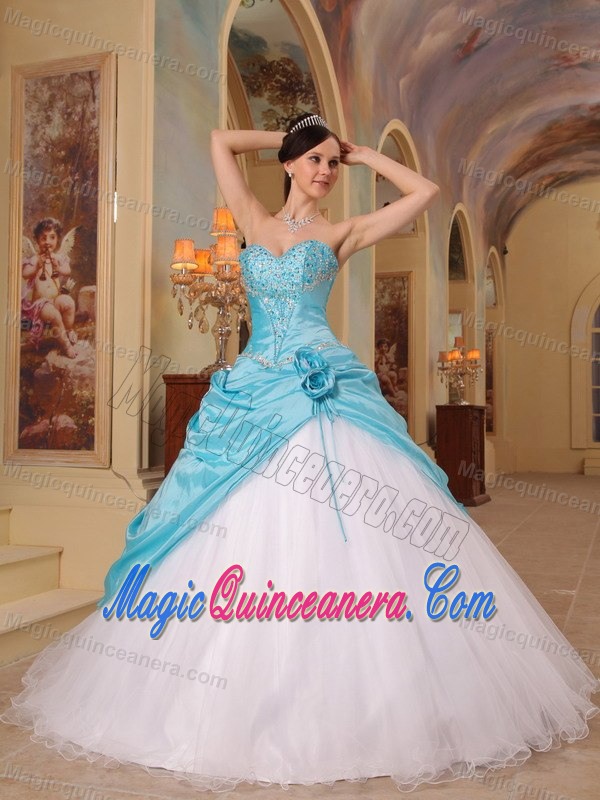 hand made flower sweet 16 dressesin riberalta, Appliqued A-line Blue and White Quinceanera Gowns with Flowers