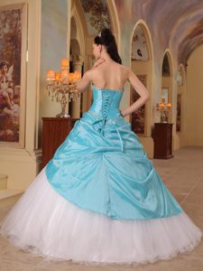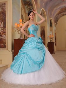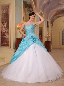 Appliqued A-line Blue and White Quinceanera Gowns with Flowers