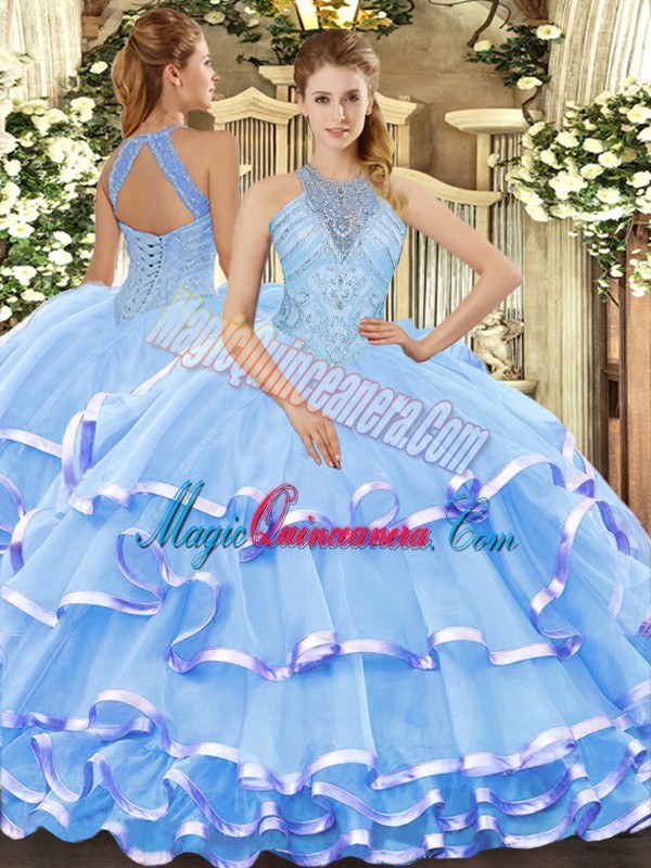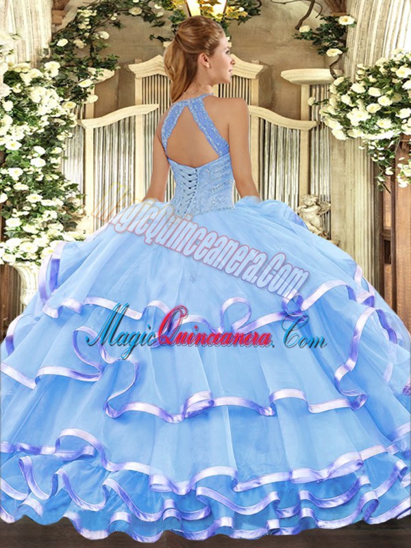 Aqua Blue Ball Gowns Beading and Ruffled Layers Ball Gown Prom Dress Lace Up Organza Sleeveless Floor Length