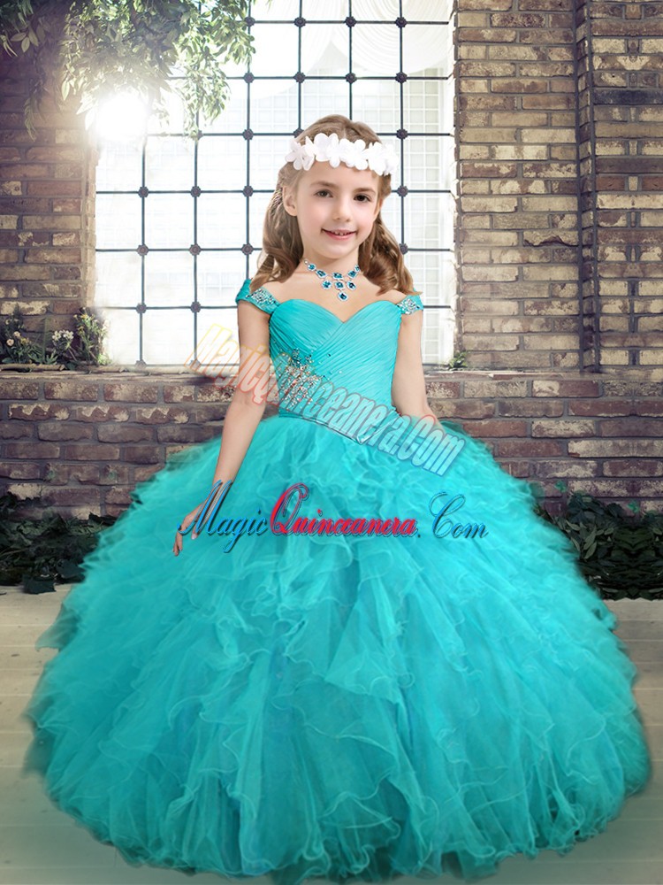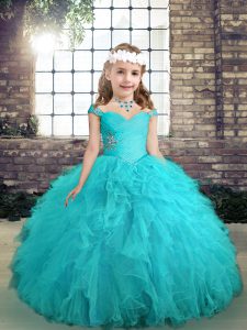 Aqua Blue Ball Gowns Beading and Ruffles Child Pageant Dress Lace Up Tulle Sleeveless Floor Length