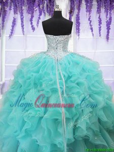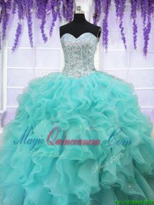 Aqua Blue Ball Gowns Sweetheart Sleeveless Organza Floor Length Lace Up Ruffles and Sequins 15th Birthday Dress