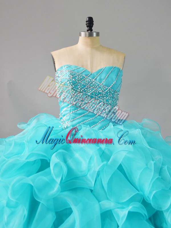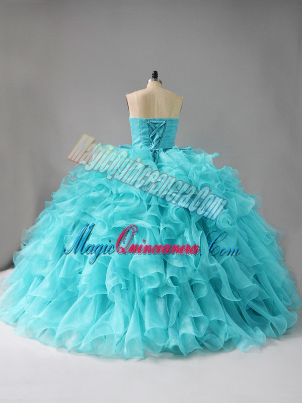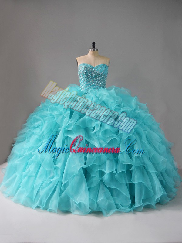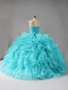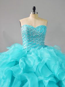 Aqua Blue Lace Up Quinceanera Gown Beading and Ruffles Sleeveless