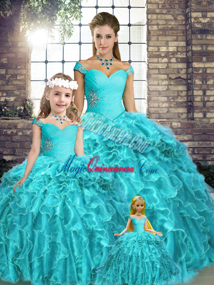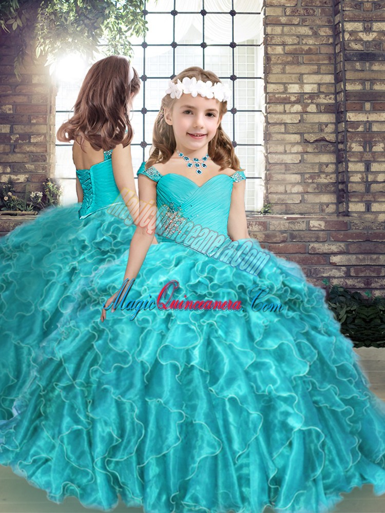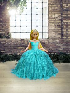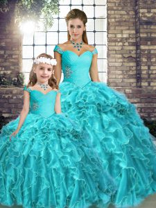 Aqua Blue Sleeveless Brush Train Beading and Ruffles 15th Birthday Dress